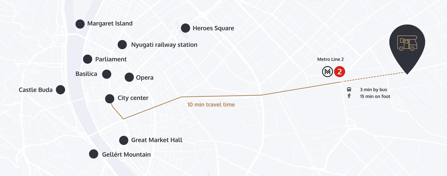 Az Örs vezér terétől közel 15 perces séta, Gödöllő irányába, a Kerepesi úton, a HÉV mentén, de a főút túloldalán. Kérjük figyelje az út mentén elhelyezett kemping piktogramot ábrázoló útbaigazító táblákat!